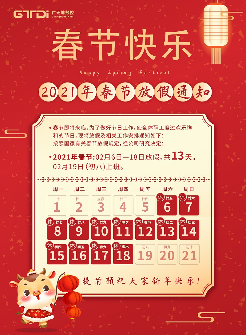 2021年春节将至,首先感谢您在2020年里的鼎力支持和愉快合作,摩根娱乐数控全体同仁在此给您拜个早年。在新年的一年里,摩根娱乐将更加努力,为您提供更优质的服务。按照国家春节放假规定结合我司的具体情况,春节放假时间安排如下: