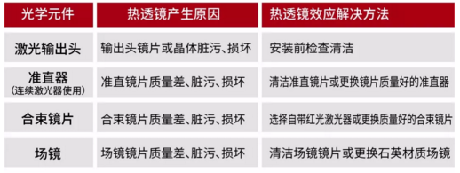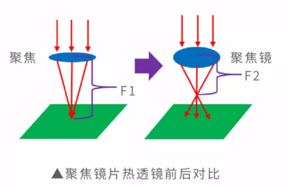 由于光学元件质量差、脏污、损坏等原因造成对激光吸收率增大,光学元件受激光束连续较长时间照射后,温度升高产生热变形,进而引起透过型光学元件的折射率和反射型光学元件的反射方向发生变化。热透镜效应会改变激光焦点(束腰)的位置,进而影响应用效果。