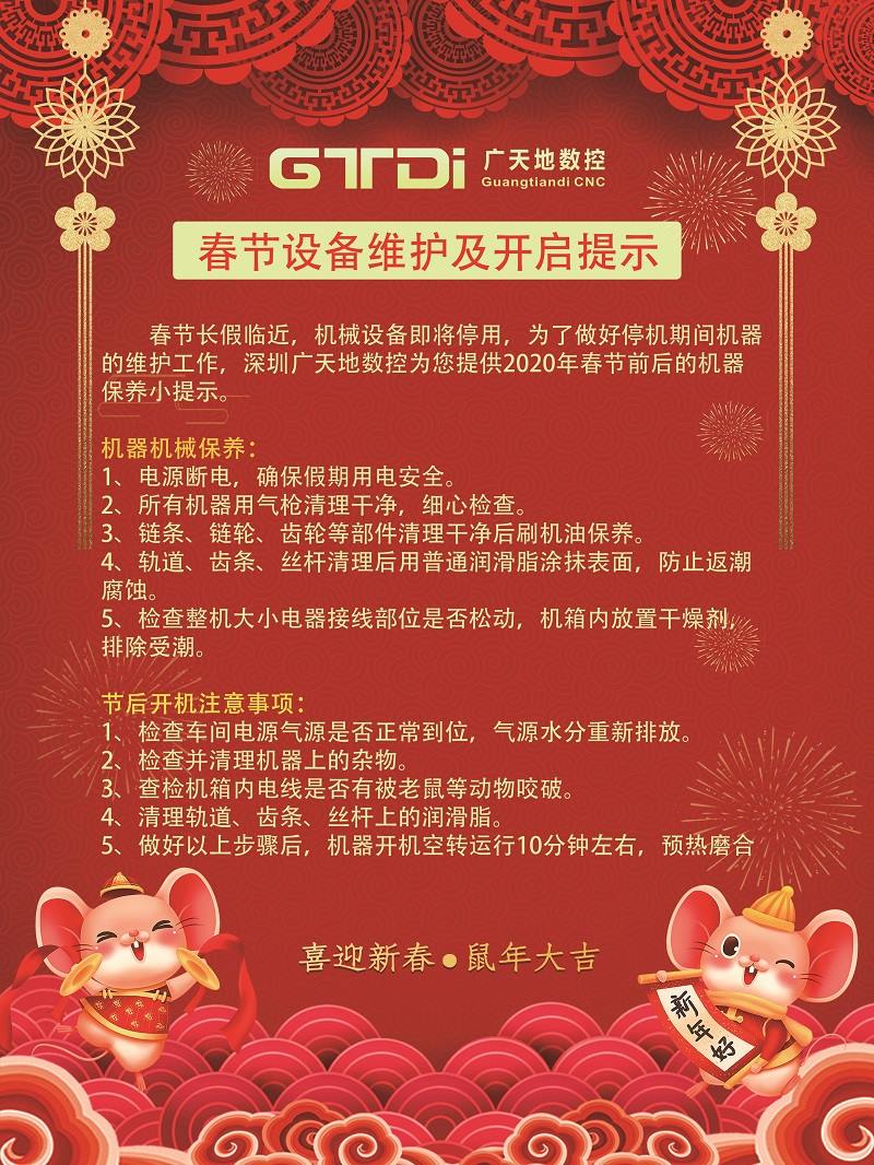 春节长假临近,机械设备即将停用,为了做好停机期间机器的维护工作,深圳摩根娱乐数控为您提供2020年春节前后的机器保养小提示。